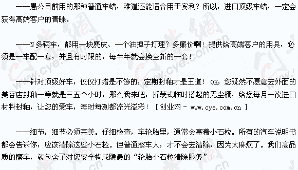 实际上,我只是随便想想,就能想出这么好几条。如果真正在运作中,和顾客贴近,肯定还能发现无数高端客户的“小小不满”,如果都尽量去理解和发掘,“差异化”不愁不够多。而差异化的结果,可能就是智者虽然收费500元一辆,还是有很多车主愿意买单。