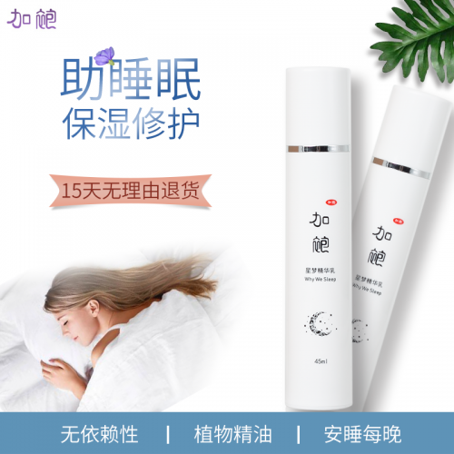 加袍星梦精华乳是一款主打帮助睡眠、保湿修护功效的精华乳液,添加各种助眠的有效精油成分,通过精油渗透进皮肤再进入血液,产生助眠镇定效果,另外,于脸部涂抹的精华乳液,所含精油成分挥发,从鼻腔进入刺激大脑前叶分泌出内啡肽及脑啡肽两种荷尔蒙,使用户的精神状态得以改善。