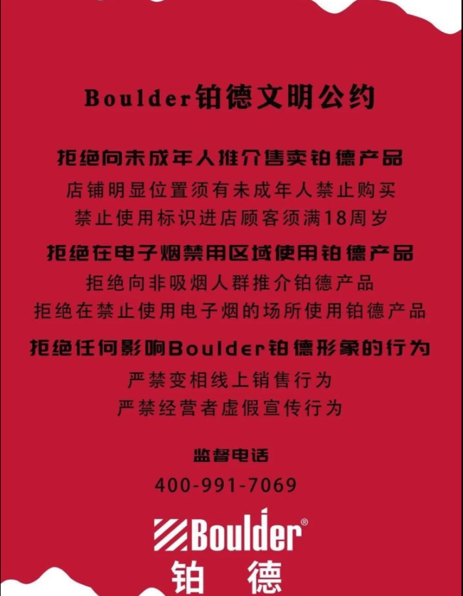 自2019年11月以来,电子烟产品被严格禁止在网络上销售。考虑到销量下滑的问题,有不法商贩依然试探违规销售。铂德及时推出《铂德文明公约》,从各个角度向渠道加盟商提出了一定要求,约束各级代理商,尤其严格制止变相线上销售的行为。